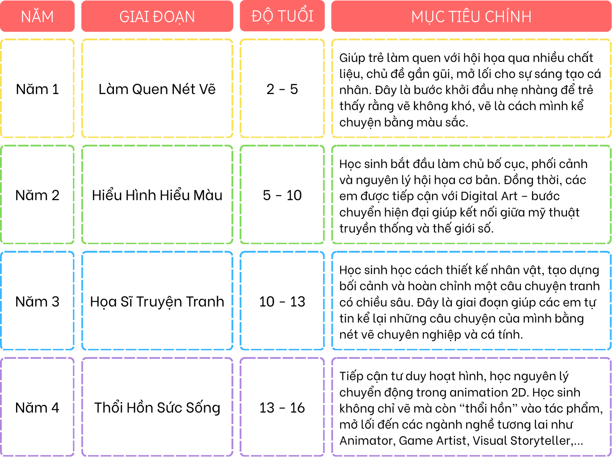 Từ bút chì đến bảng vẽ số – lộ trình mỹ thuật 4 năm kết hợp giữa truyền thống và công nghệ, giúp trẻ phát triển tư duy nghệ thuật và cá tính sáng tạo riêng.